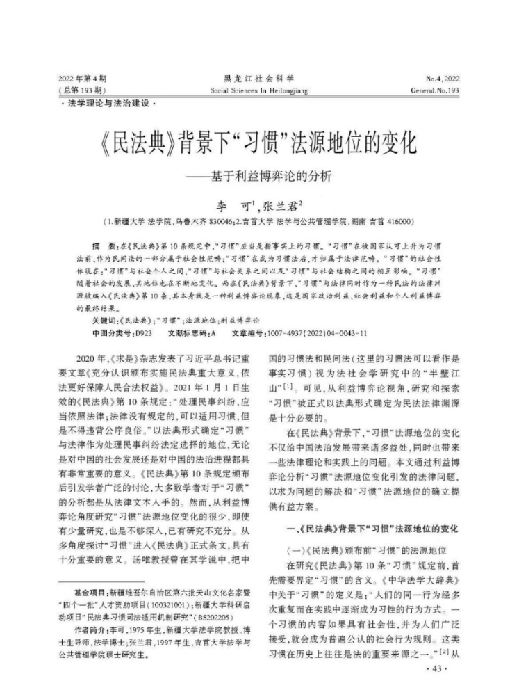 我院客座教授李可、硕士毕业生张兰君合作的专业论文《中华人民共和国民法典背景下“习惯”法源地位的变化》被《中国社会科学文摘》2023年第1期以《中华人民共和国民法典背景下“习惯”法源地位的变化》为篇名转载。