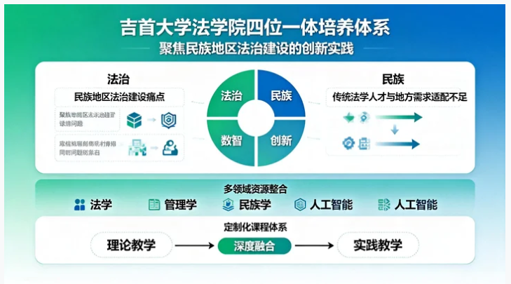 为提升人才培养实效,学院主动联动地方司法部门搭建高水平实践平台,将课堂教学与司法实务紧密衔接,让学生在基层法治服务、真实案例处理中锤炼专业技能。这种兼顾专业深度、地域特色、技术前沿与创新能力的培养模式,有效破解了民族地区法学人才“引留难、用得上”的现实困境,已为区域法治建设输送了一批又一批“懂法律、通民族、善数智、敢创新”的复合型人才。