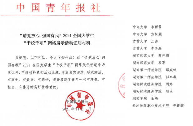 本网讯(通讯员 刘蕾 潘宇霞 饶琮琪)近日,在由中国青年报社主办、中青在线承办的“请党放心 强国有我”2021全国大学生“千校千项”网络展示活动中,我院2018级法学2班学生李喜磊获评“个人事迹奖”。