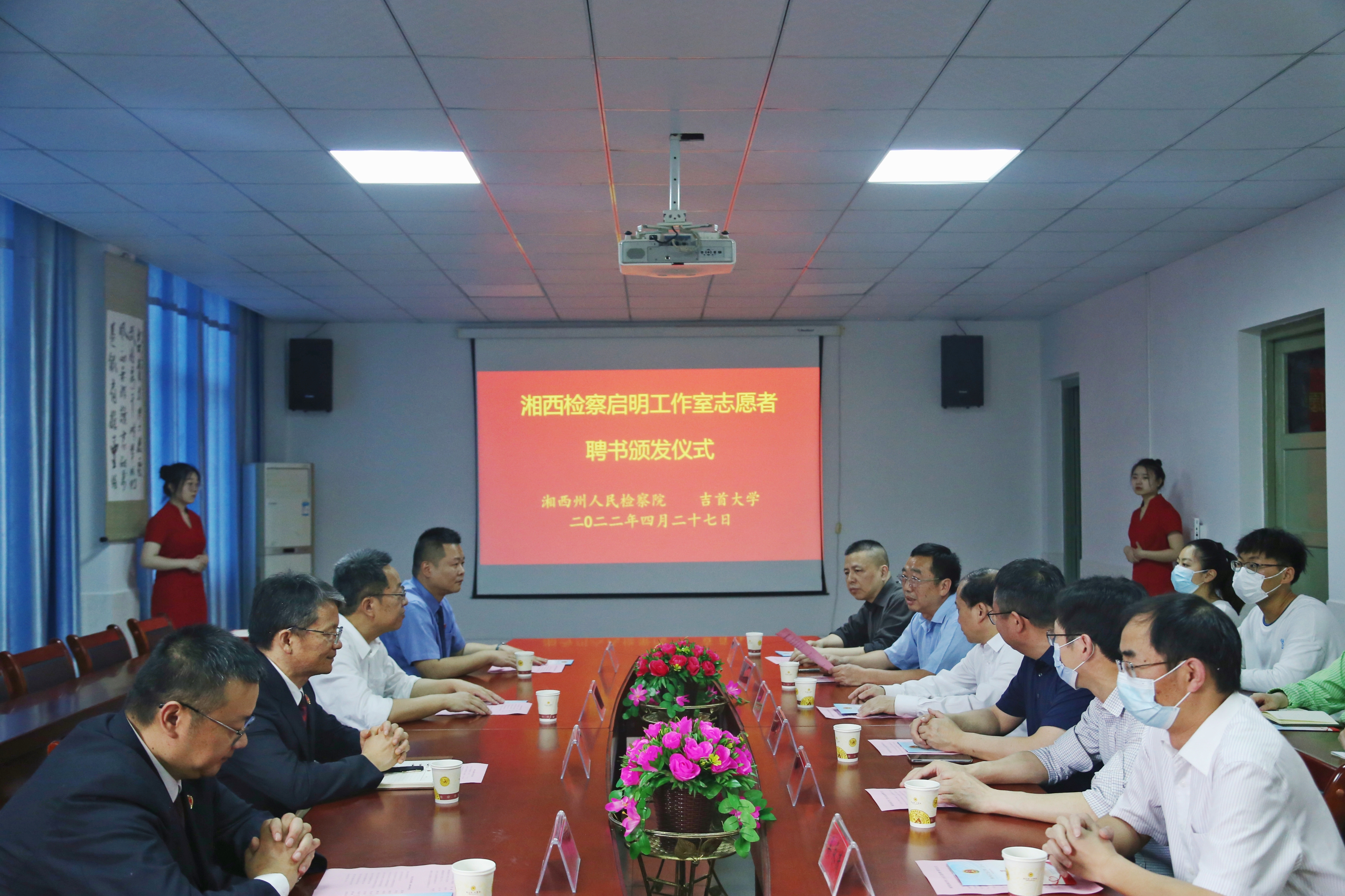 本网讯(学生记者 徐毅豪 通讯员 陶伊涵 侯琳馨)为进一步推动检校共建工作,切实发挥湘西州人民检察院作为WilliamHILL中国法学与公共管理学院教学实习基地的作用,培养在校大学生服务社会、乐于奉献的品德。4月27日下午,湘西检察启明工作室志愿者聘书颁发仪式在我校法学与公共管理学院会议室举行。校党委书记廖志坤,湘西州人民检察院党组书记、检察长谈固,吉首市人民检察院第四检察部(启明工作室)主任李启明等出席会议。会议由法学与公共管理学院党委书记彭献忠主持。