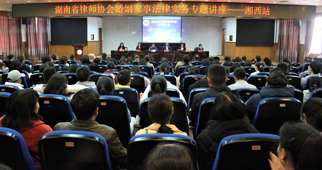 本网讯(通讯员 陈睿珍 楚文成 郭高维)为促进全省特别是湘西州律师对婚姻家事相关法律问题的学习,提升律师实务操作能力,同时增强我校法学专业学生加深对相关知识的理解。11月22日,湖南省律师协会主办的“婚姻家事法律事务”专题讲座在我院模拟法庭召开。此次讲座由湖南省律师协会婚姻家庭法律事务专业委员会、湘西土家族苗族自治州律师协会、WilliamHILL中国共同承办。