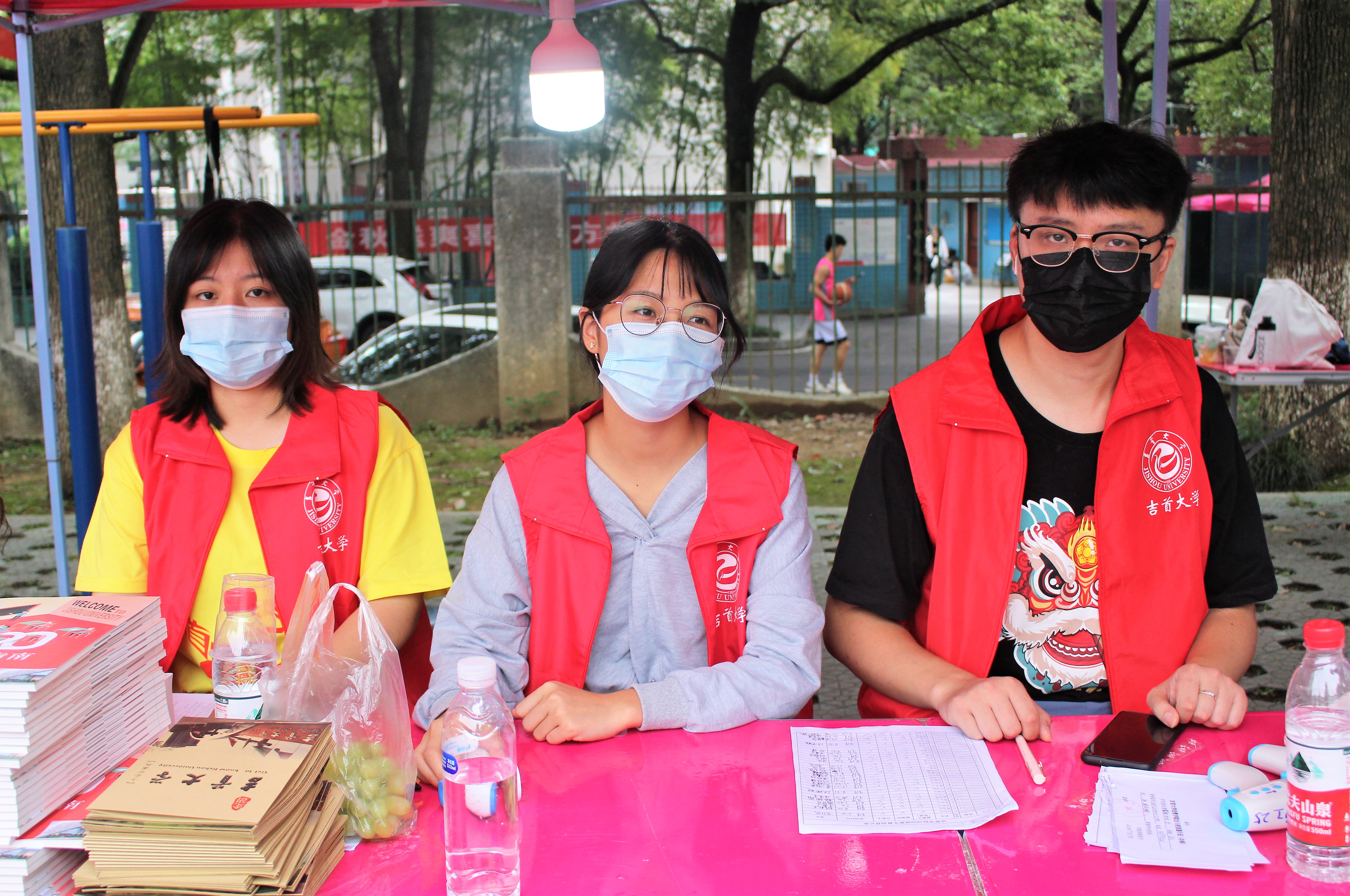 清晨天才微亮时,志愿者们就已经在工作地点等待新生。接待组的志愿者以饱满的热情在北门门口迎接新生,并为他们分担行李。仍处在疫情防控时期,防疫工作不可忽视,新生们入校后经过行李箱消毒、擦洗手液消毒、换新口罩等程序后才在志愿者的带领下到操场报到处进行报到注册。