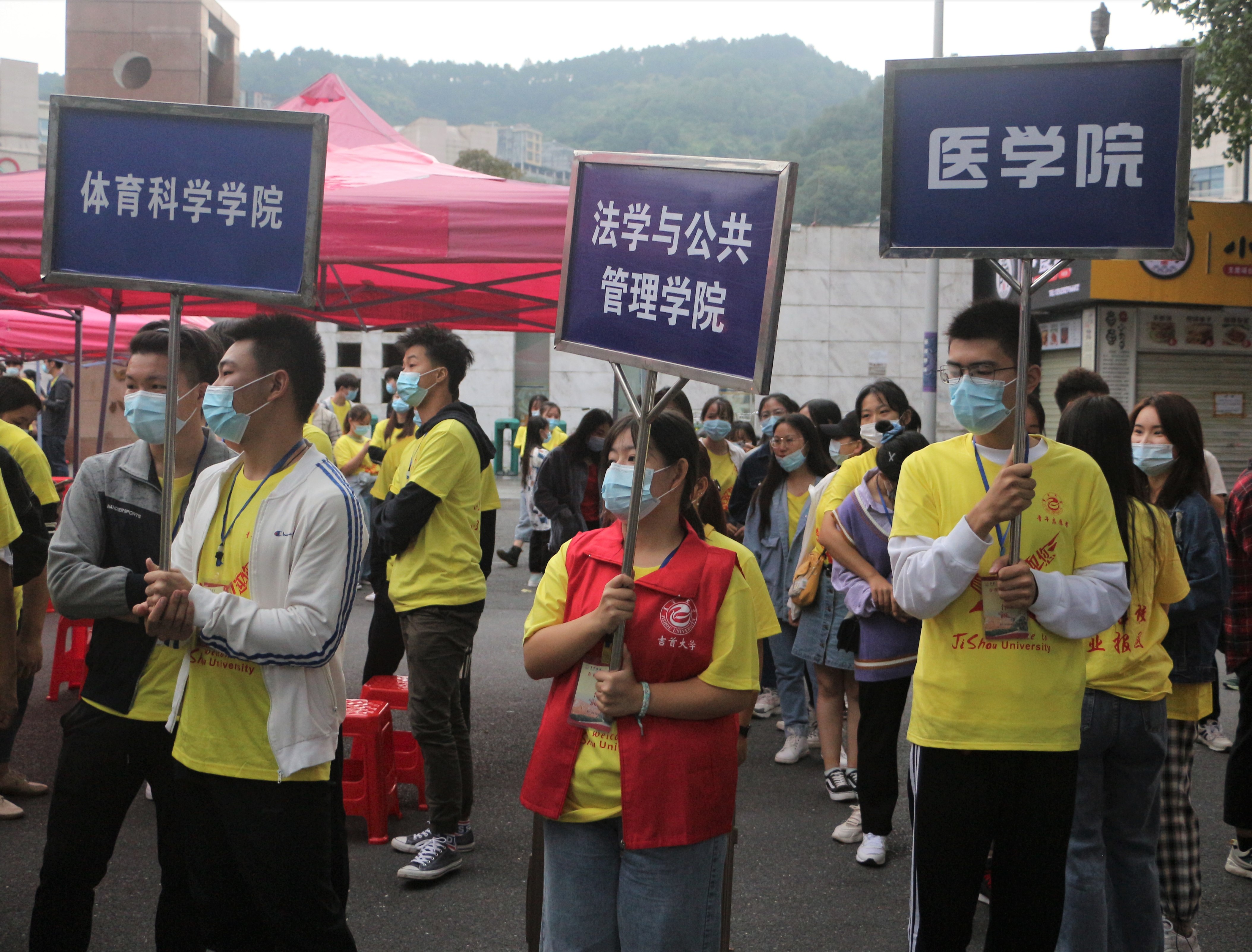 (图为志愿者在北门迎接新生 摄 黄思榕)