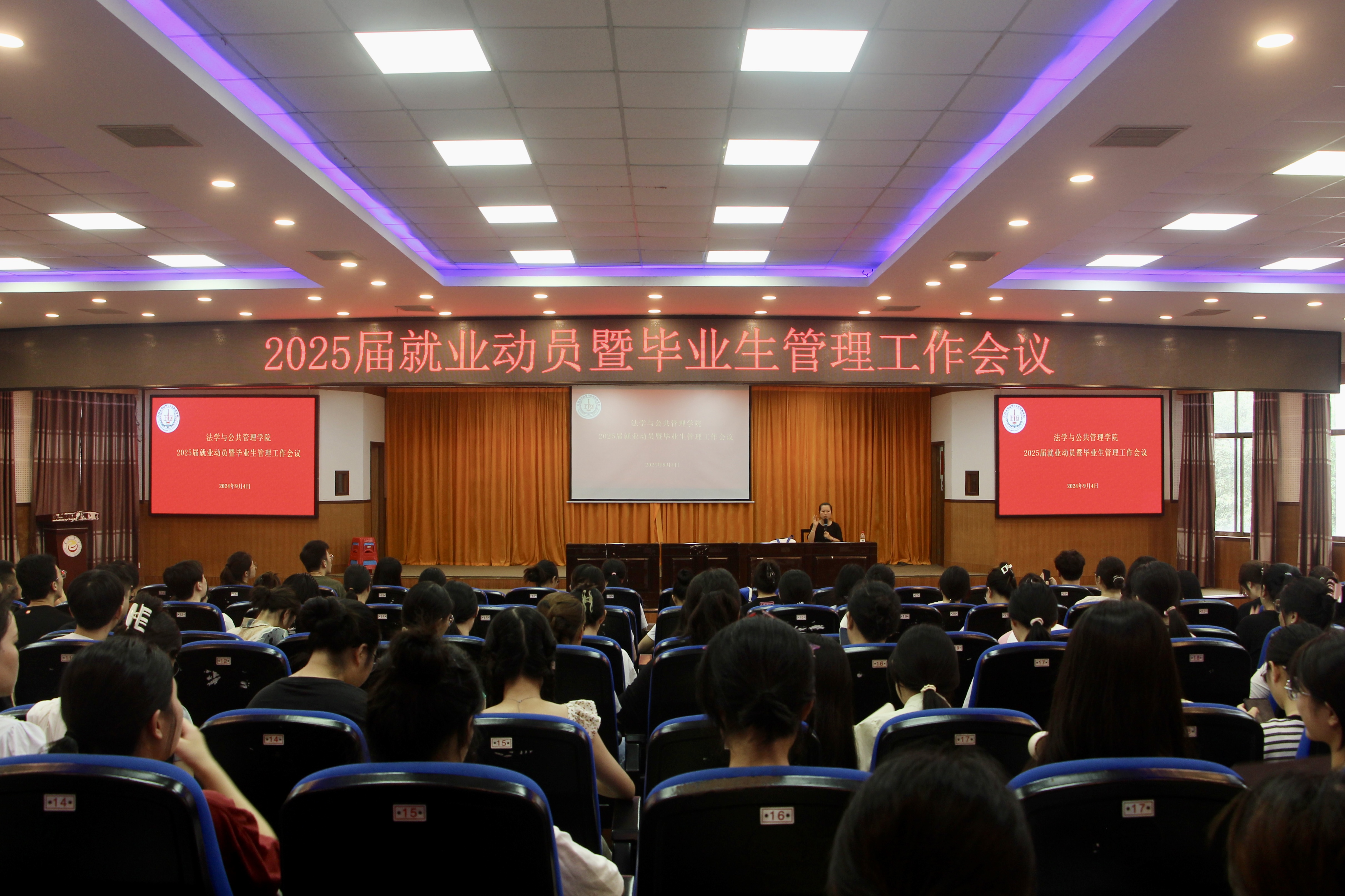 为切实推进毕业生就业指导工作与学生管理工作,9月4日,我院在砂子坳校区模拟法庭召开2025届就业动员暨毕业生管理工作会议,会议由学工办主任杨川主持。