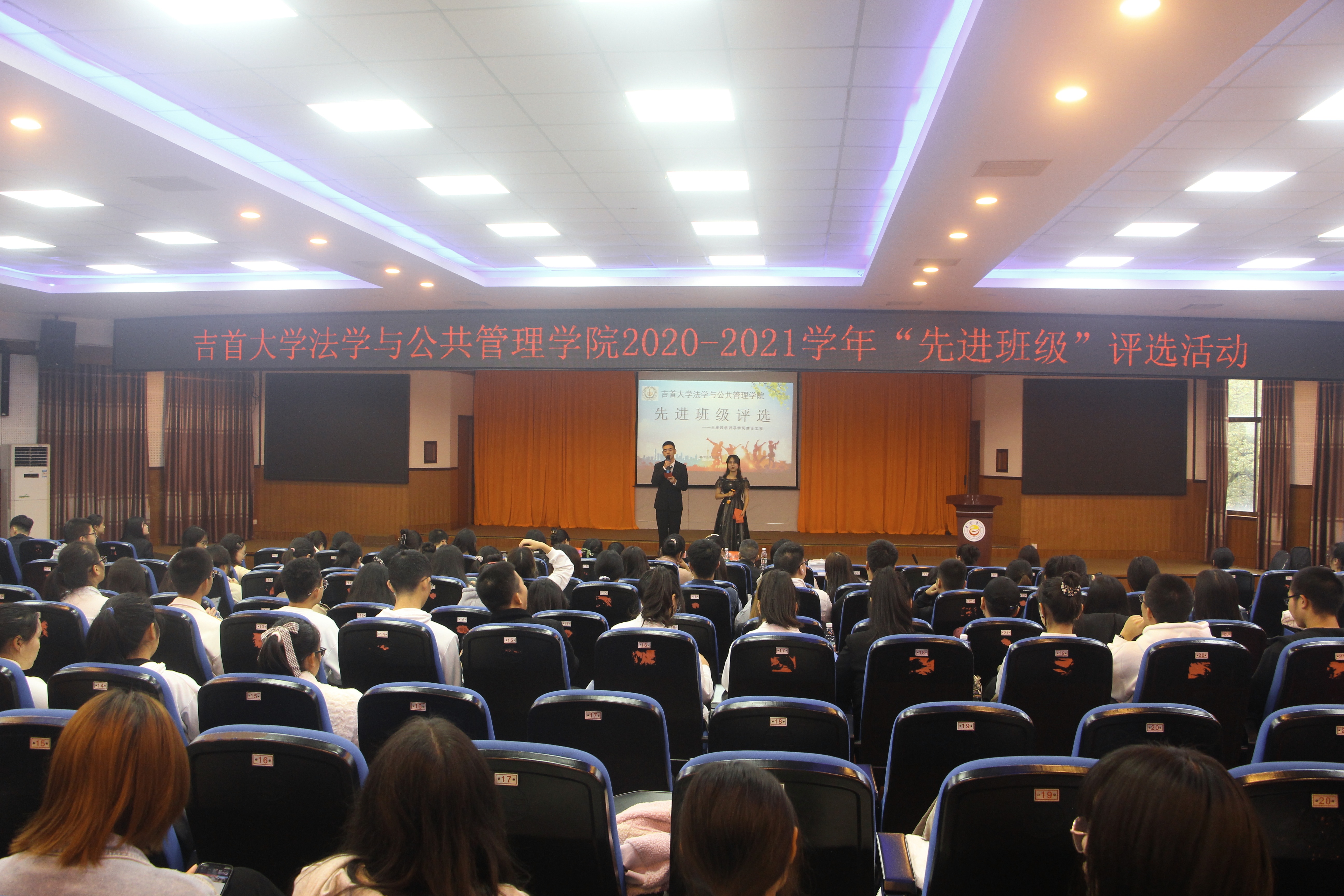 本网讯(通讯员 刘婕妤 柳盈)为了加强我院班风建设,促进各班形成争创先进的良好局面,11月5日,我院在模拟法庭举办2020-2021学年“先进班级”评选活动。我院党委书记彭献忠、党委副书记陈蓉、副院长魏风劲、学工办主任文兰、团委书记哈米拉提·买合木提受邀担任评委,隆奕、朱颖、林旭鑫老师作为嘉宾出席本次活动。