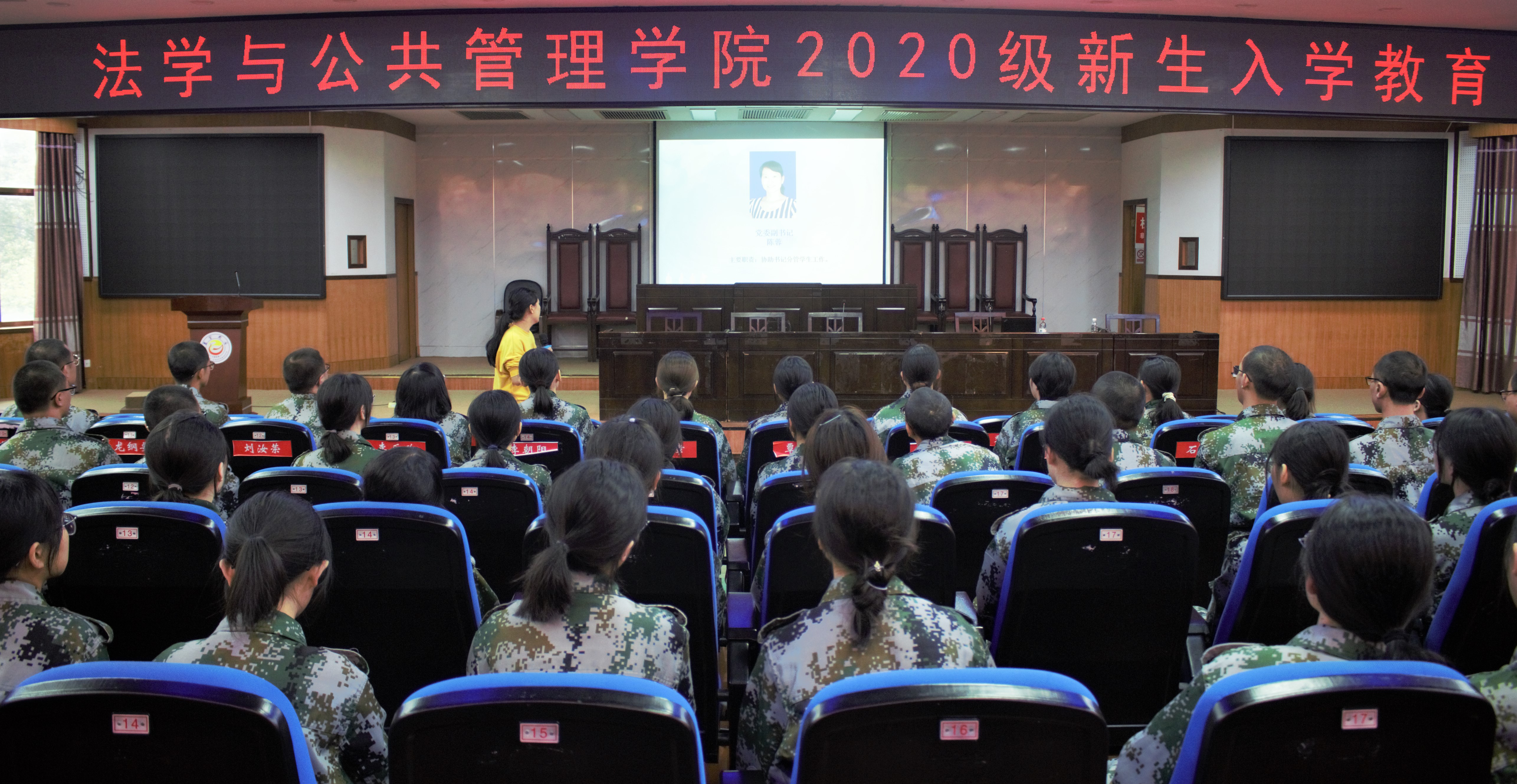 本网讯(通讯员 郭丽)为增强新生文明礼貌意识,提高诚实守信的道德修养,9月25日,我院在模拟法庭围绕礼仪修养和诚实守信的重要性开展新生教育讲座。本次讲座由学工办主任文兰主持,我院全体新生参与。