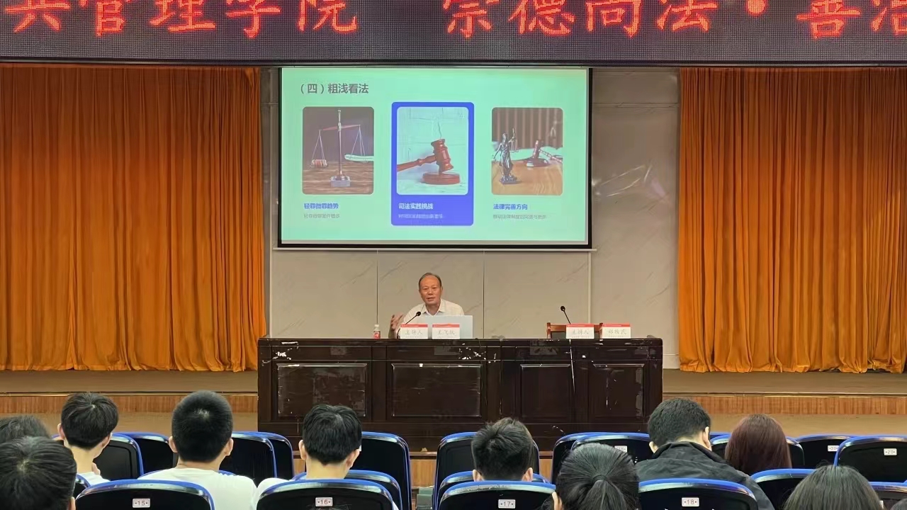 5月17日,在我院砂子坳校区模拟法庭,一场以“崇德尚法·善治为公”为主题的学术讲堂如期举行。本次讲座有幸邀请到中南林业科技大学william威廉中文教授兼院长王飞跃主讲,他围绕“当前刑事法学几个热点问题的冷思考”这一主题,为我院2021级法学专业的学生带来了一场思想盛宴。讲座由我院主持工作副院长郑牧民主持。