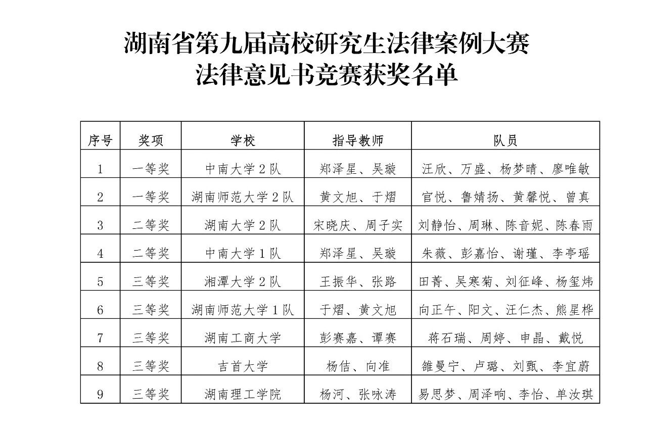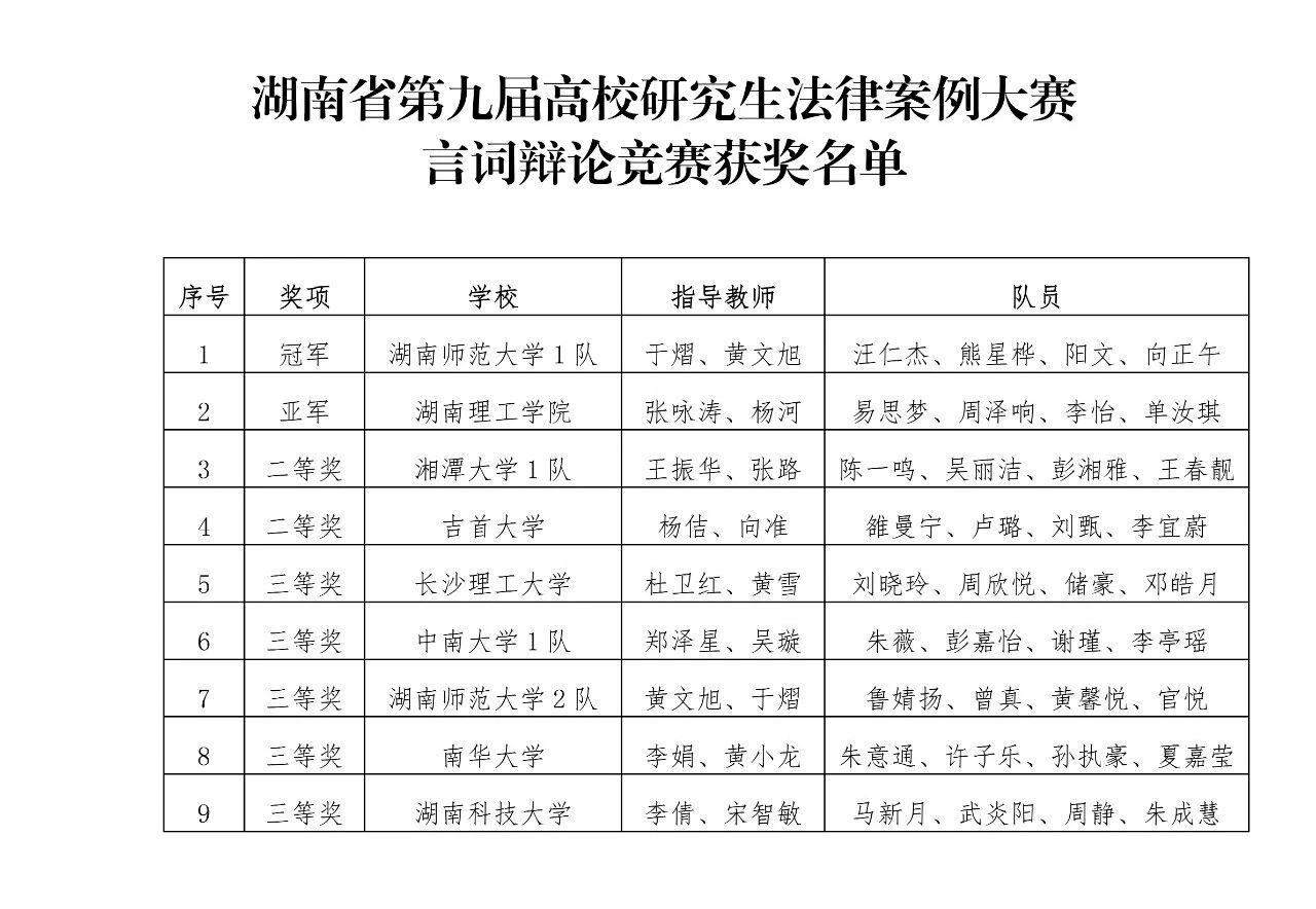 本网讯(通讯员:向芃、严茜)11月15-16日,由湖南省教育厅主办、湖南师范大学承办的湖南省第九届高校研究生法律案例大赛圆满落幕。省内中南大学、湖南大学、湖南师范大学、湘潭大学等13所开设法学(法律)专业硕士点高校的17支队伍参赛(含湖南省委党校,其中中南大学等4所规模较大的高校各有2支队伍参赛),比赛分为“法律意见书竞赛”和“言词辩论竞赛”两个阶段。其中,我校研究生代表队凭借扎实的专业素养和出色的发挥,在言词辩论竞赛中斩获二等奖,并在法律意见书竞赛中荣获三等奖。团队刘甄同学荣获“优秀辩手”个人称号,充分展现了WilliamHILL中国法学研究生的综合实力。获奖名单如下: