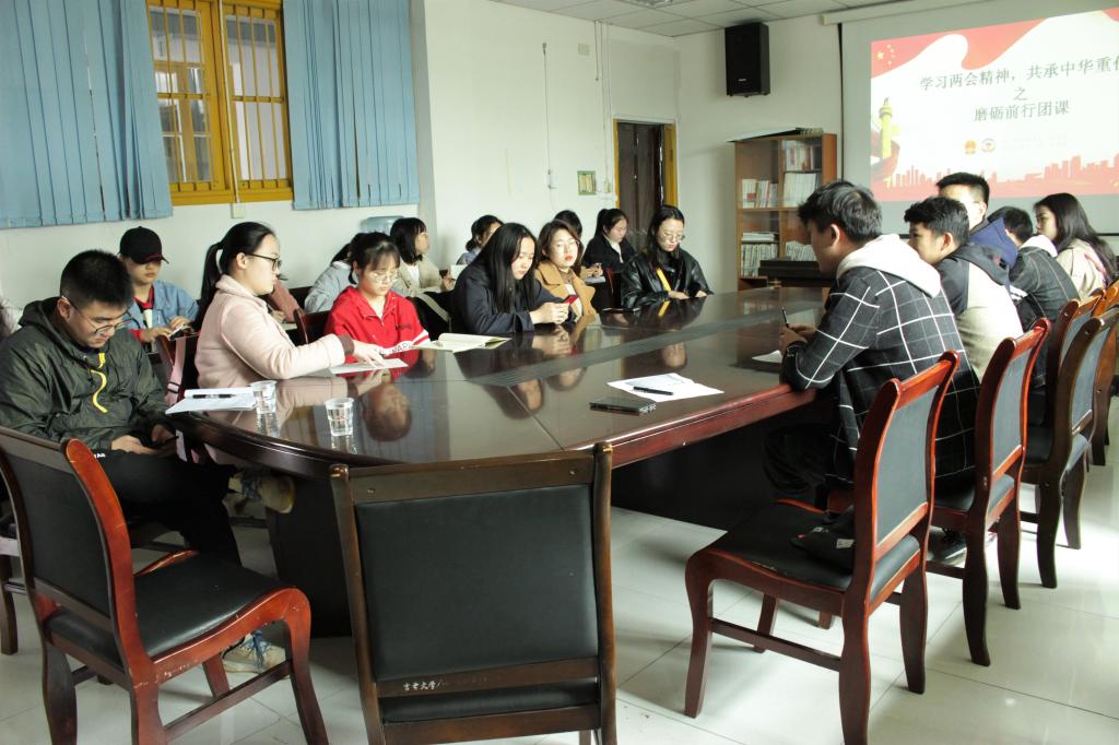 本网讯(通讯员 蒋珊、熊澜)为推动广大同学聚焦时政、学习“两会”精神、增强政治素质,3月26日中午,我院在院会议室开展“学习两会精神,共承中华重任”主题团课活动。我院学工办主任段武城,团总支书记任倩,16、17、18级各班团支书以及团总支全体成员参加此次团课。团课由团总支干事李志伟主讲。